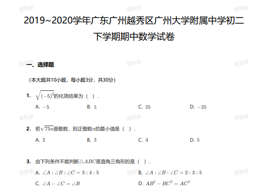 小编为大家整理了2019~2020学年广东广州越秀区广州大学附属中学初二下学期期中数学试卷及答案,初中,是中学阶段的初级阶段,是向高级中学过渡的一个阶段。八年级是整个中学的转折点,亦是“储力”的一年。