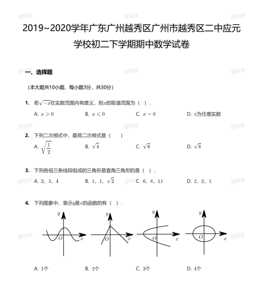 小编为大家整理了2019~2020学年广东广州越秀区广州市越秀区二中应元学校初二下学期期中数学试卷及答案,初中,是中学阶段的初级阶段,是向高级中学过渡的一个阶段。八年级是整个中学的转折点,亦是“储力”的一年。