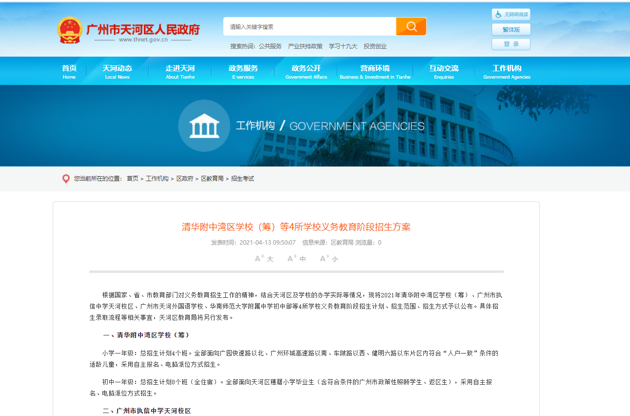 根据国家、省、市教育部门对义务教育招生工作的精神,结合天河区及学校的办学实际等情况,现将2021年清华附中湾区学校(筹)、广州市执信中学天河校区、广州市天河外国语学校、华南师范大学附属中学初中部等4所学校义务教育阶段招生计划、招生范围、招生方式予以公布。具体招生录取流程等相关事宜,天河区教育局将另行发布。