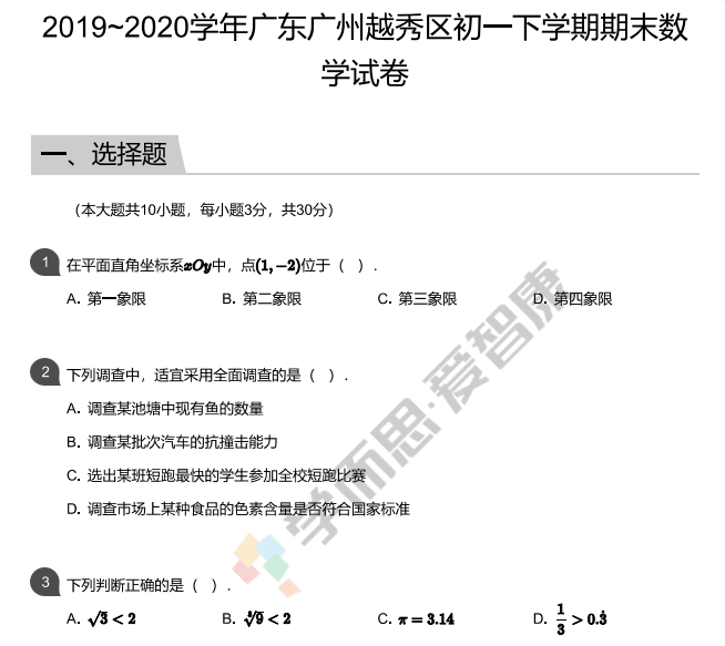 小编整理了2019~2020学年广东广州越秀区初一下学期期末数学试卷及答案,每套期末试卷是一个学期的学习成果检验的方法,通过测试来表达同学们在学习中存在的问题,能够及时发现错误,及时改正。