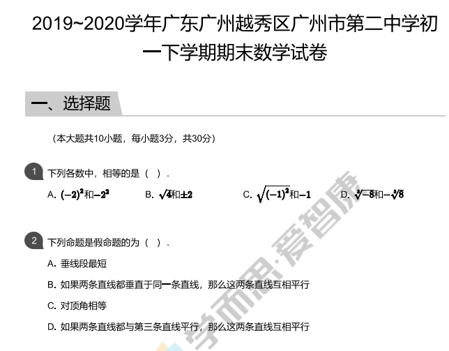 小编整理了2019~2020学年广东广州越秀区广州市第二中学初一下学期期末数学试卷及答案,每套期末试卷是一个学期的学习成果检验的方法,通过测试来表达同学们在学习中存在的问题,能够及时发现错误,及时改正。