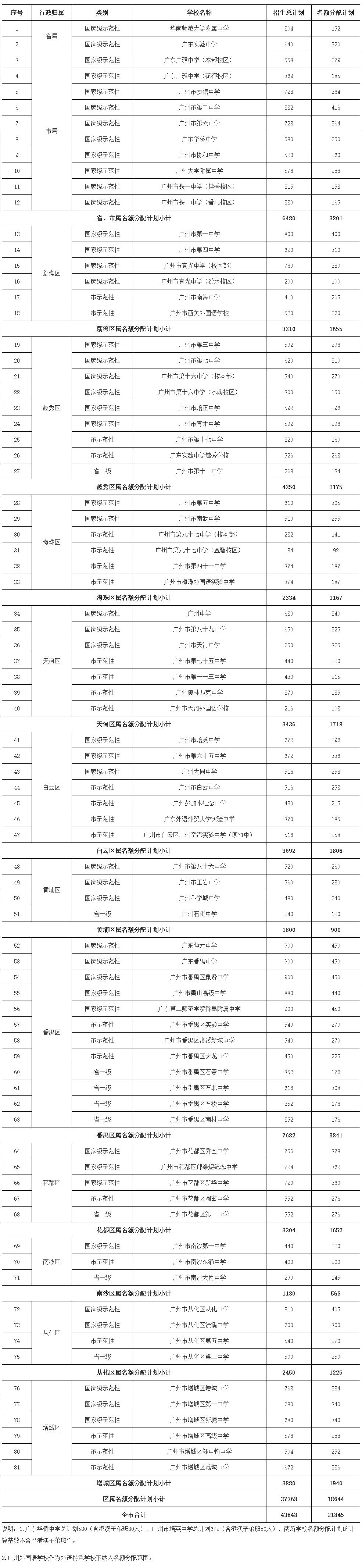 其中,国家级示范性普通高中43所,47校区,名额分配计划为14558个;广州市示范性普通高中24所,25个校区,名额分配计划为5526个。