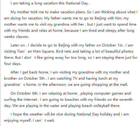 以上就是小编为大家整理的2021年八年级关于国庆节的英语作文(五),同学们还有其他学习上的问题,可拨打免费课程咨询热线电话:400-810-2680,那里有专业的老师为大家解答。