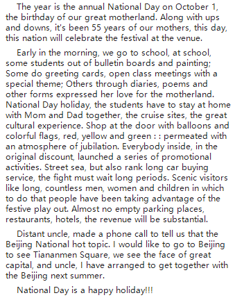 2021年九年级关于国庆节的英语作文(一)!每年的10月1日是全国各族人民隆重欢庆的节日。国庆佳节,能够去天安门广场看升国旗是无数人心中的梦想。下面是小编为大家整理的2021年九年级关于国庆节的英语作文(一),供同学们学习参考。