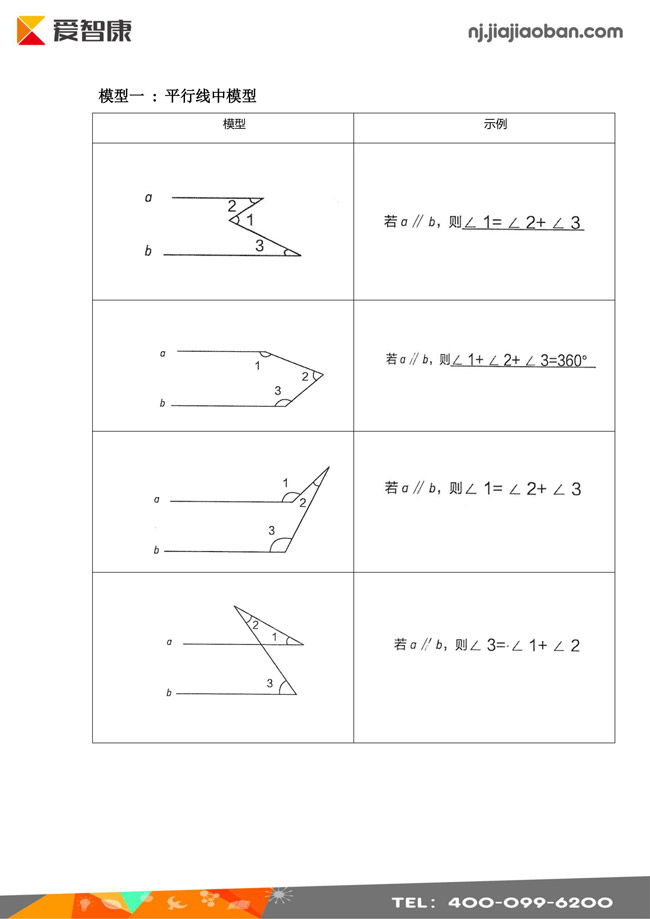 【智康语】进入六月,除了举国关注的中高考,其他年级也要进入期末考试的查漏补缺阶段了,而纵观整个初一下学期的数学课程,几何部分虽然只有一章,却绝对是重点和难点,这其中倒角模型尤其的让孩子们头痛,这里与大家分享一份资料,这份资料里几乎囊括了整个初一下学期的几何模型,希望对那些对平行线和三角形中倒角模型还不熟悉的孩子能够有所帮助!