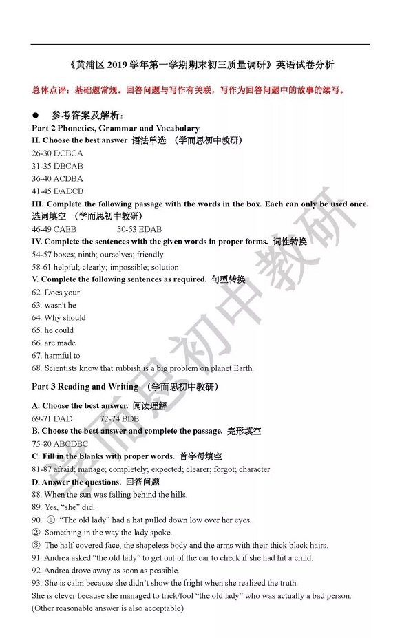 2020年上海黄浦区初三一模英语试题及答案(9)