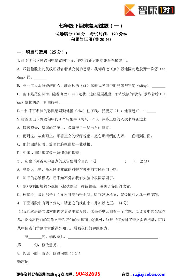 2015-2016学年下学期深圳各初中期末考试即将开始,小编为大家整理了初一语文下册期末考试试题及答案,下面就是初一语文下学期期末试题及答案。如有更多问题,可以加入深圳智康初中交流群: