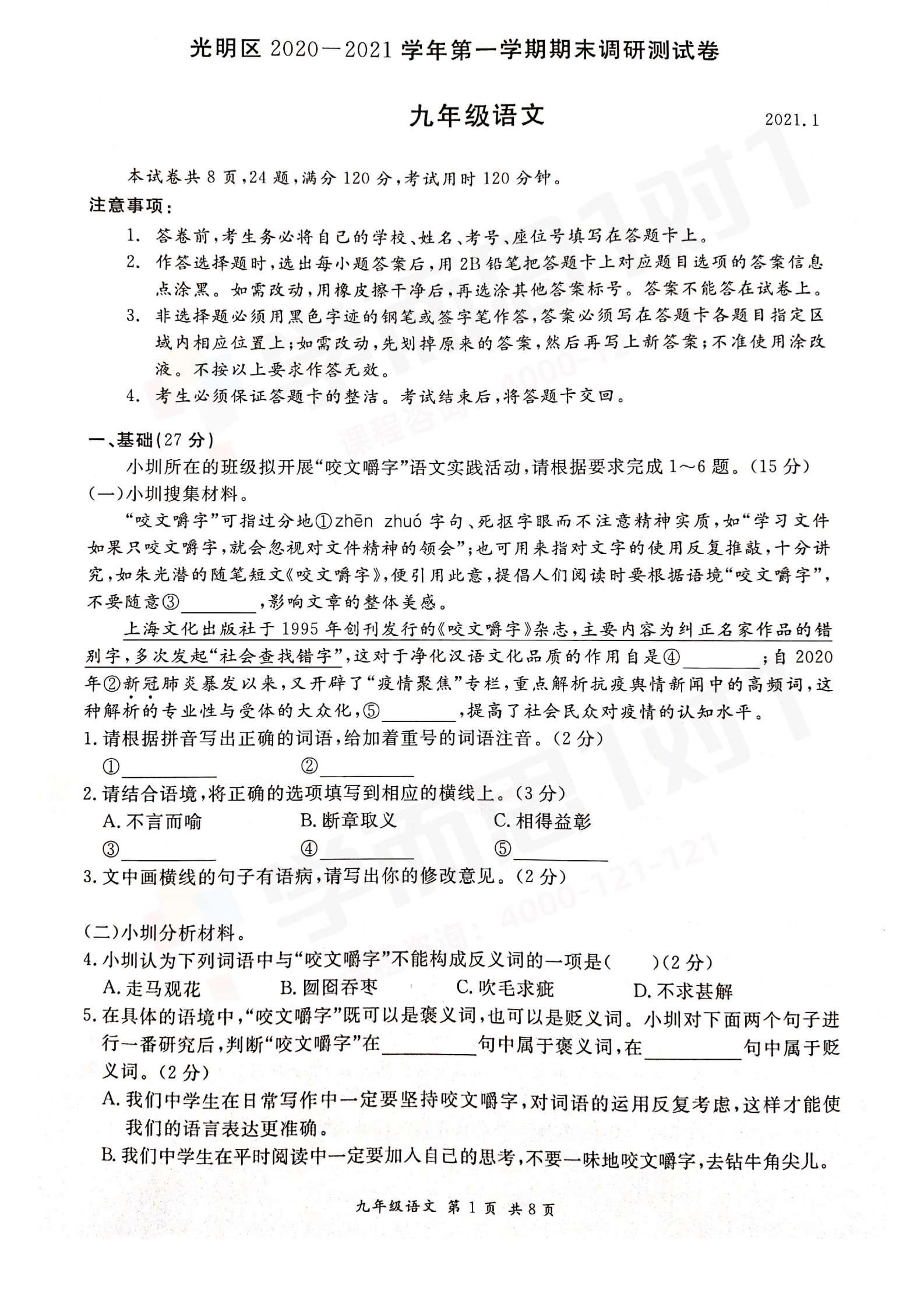 上面是2020-2021学年深圳光明初三上期末考试语文试卷及答案的部分内容,想知道下载试题请看下方!