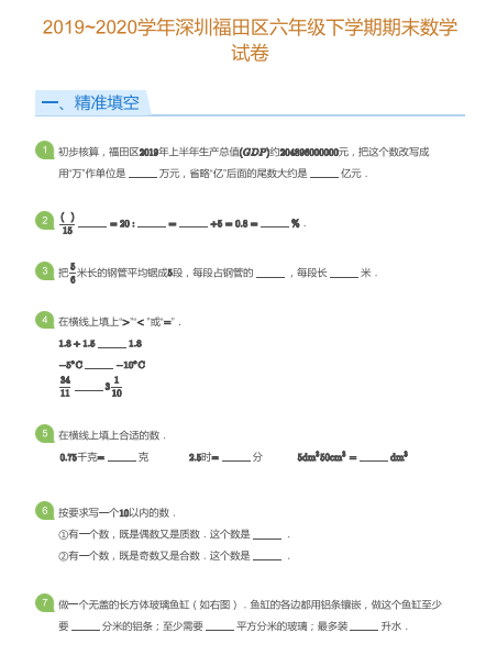 上面是2019-2020学年深圳福田区六年级下期末数学试卷及答案的部分内容,想知道下载试题请看下方!