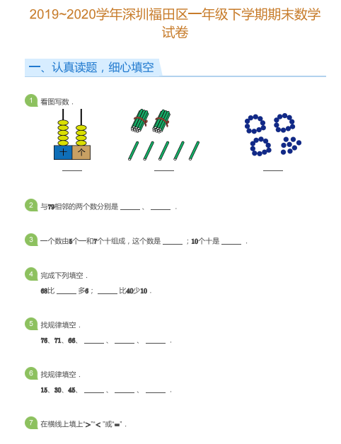 上面是2019-2020学年深圳福田区一年级下期末数学试卷及答案的部分内容,想知道下载试题请看下方!