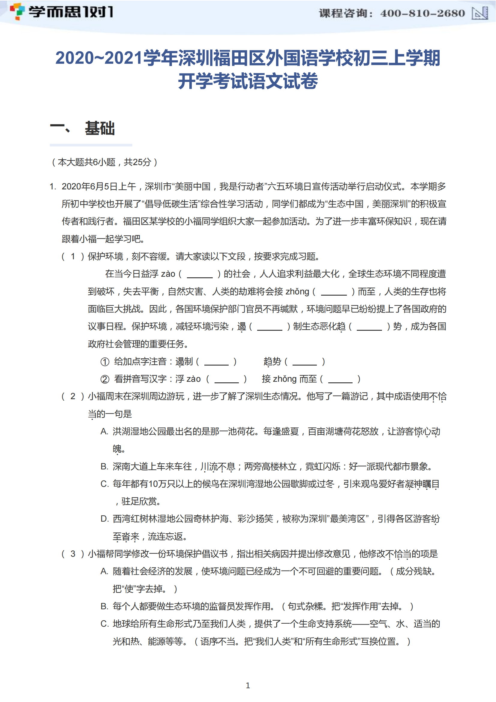 上面是2020-2021学年深圳福田外国语学校初三上开学考语文试卷及答案,请点击下方附件链接下载全部试题内容。