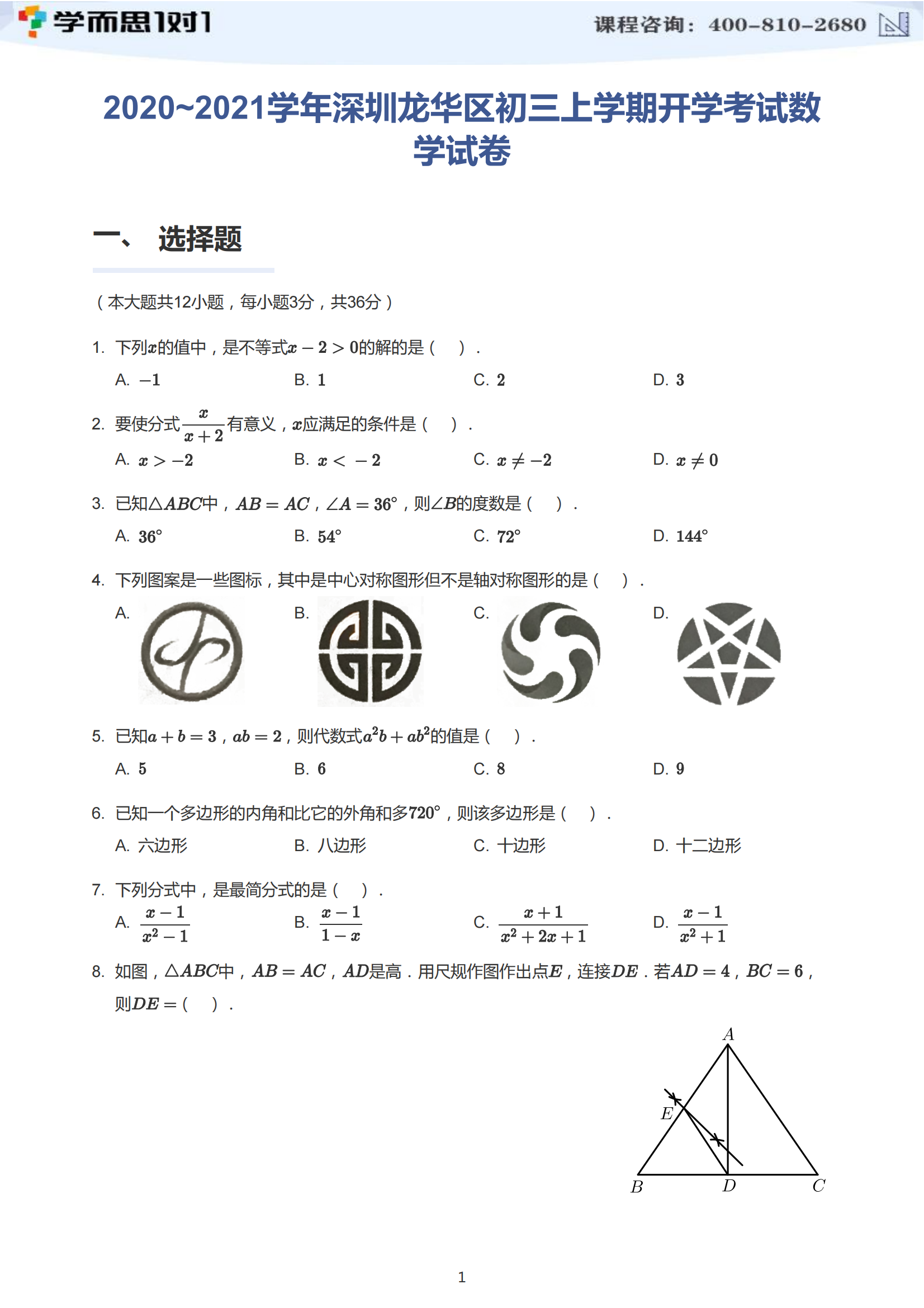 上面是2020-2021学年深圳龙华区初三上开学考数学试卷及答案,请点击下方附件链接下载全部试题内容。