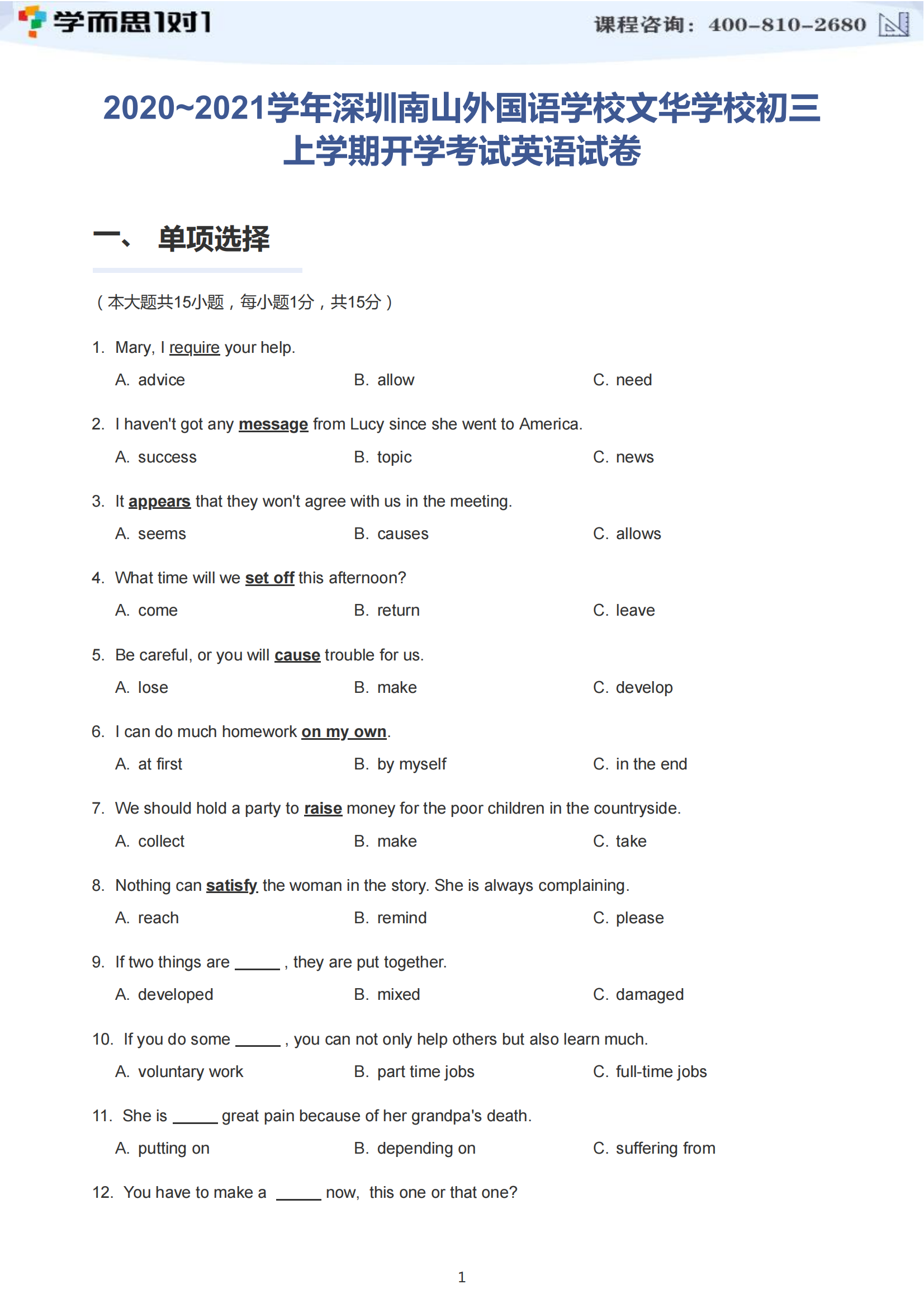 以上就是小智为各位同学整理带来的2020-2021学年深圳南山外国语学校初三上开学考英语试卷及答案,如果家长有想领取开学、期中、期末等试题资料,可以添加康康QQ:493924147,也可以拨打免费电话:400-810-2680,那里有专业的老师为您解答。