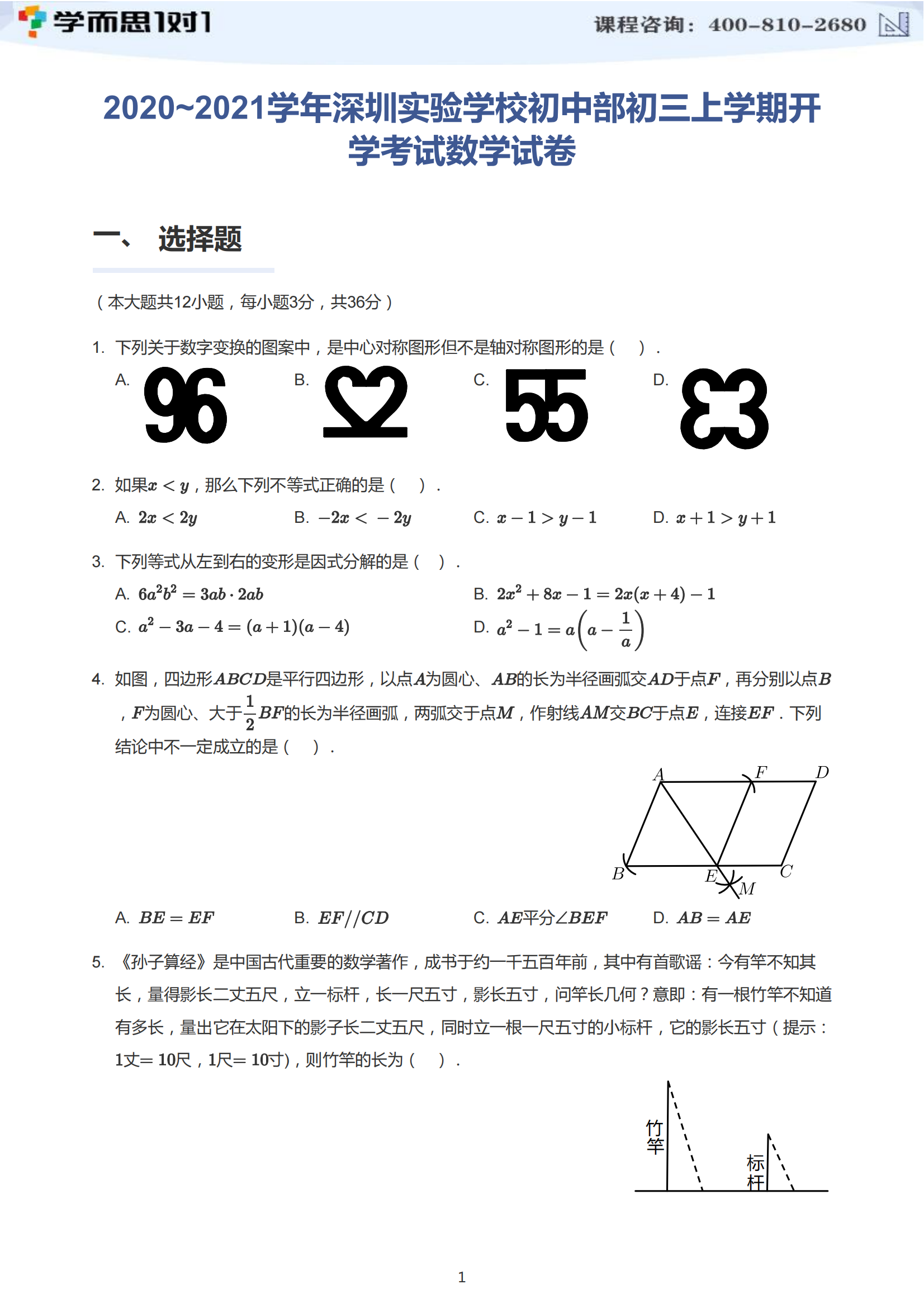 上面是2020-2021学年深圳实验学校初三上开学考数学试卷及答案,请点击下方附件链接下载全部试题内容。